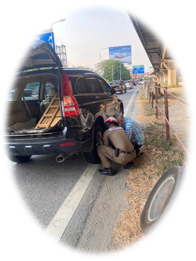 วันที่ 8 มี.ค. เวลา 11.23 น. น. ระหว่างการปฏิบัติหน้าที่เวรหน้าพันธุ์ทิพย์และเวรกรุงนำเฮง ได้รับแจ้งจาก ศูนย์วิทยุจราจรรัตนาฯ ว่ามีเหตุการจราจรติดขัดบริเวณถนนบนถนนงามวงศ์วาน (ขาออก) จึงได้ออกตรวจสอบ พบว่ามีรถยนต์หมายเลขทะเบียน กษ 9409 กรุงทพมหานคร ว.18 ยางแตก จอดอยู่ช่องทางขวาสุดของถนน จึงเข้าทำการให้ความช่วยเหลือเปลี่ยนยางรถยนต์และอำนวยการจราจรเพื่อความรวดเร็วและรีบเคลื่อนย้ายรถเข้าที่ปลอดภัยเพื่อป้องกันอุบัติเหตุซ้ำซ้อน